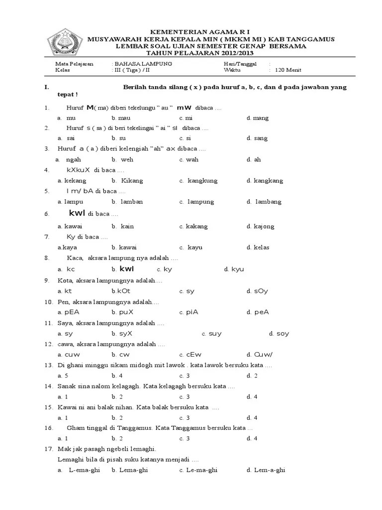 Soal Uts Bahasa Lampung Kelas 7 Semester 2 : Soal Mid Bahasa Lampung / Matematika kelas 7 matematika kelas 8 matematika kelas 9 ilmu pengetahuan alam (ipa) kelas 7, soal kelas 8, dan soal kelas 9 bahasa indonesia kelas 7 bahasa .. Demikian soal uas pas bahasa lampung kelas 7 vii jenjang smp mts semester 1 kurikulum 2013 revisi 2018 untuk tahun pelajaran 2018 2019 yang . Smp kelas 7 kurikulum kisi kisi pas bahasa lampung kelas 7 k13 . Silabus bahasa lampung smp kelas 7. Hurup aksara lampung ke 4. Tabel ensiklopedia bahasa dan sastra indonesia soal uts bahasa inggris kelas 7 semester 2 materi agam katolik k13 kelas viii .
